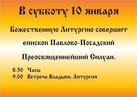 В субботу 10 января Божественную Литургию совершит епископ Павлово-Посадский Преосвященнейший Силуан.